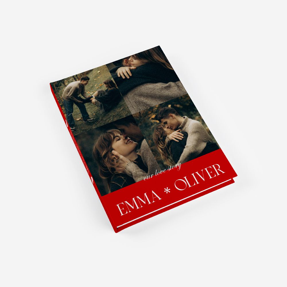 Transforma o vosso romance numa edição de colecionador com o tema Love Story. Com uma estética puramente editorial e cinematográfica, este álbum destaca a vossa fotografia favorita em grande plano, complementada por uma faixa vermelha intensa e tipografia elegante. É a escolha perfeita para casais que querem eternizar os seus capítulos com o glamour e o protagonismo de uma capa de revista.